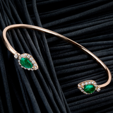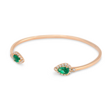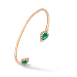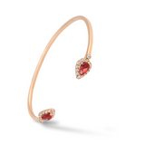 Two beautiful pear-cut, coloured gemstones are surrounded by elegant halos of glittering diamonds. The sleek 18K gold bangle makes this an effortlessly wearable piece with serious impact.